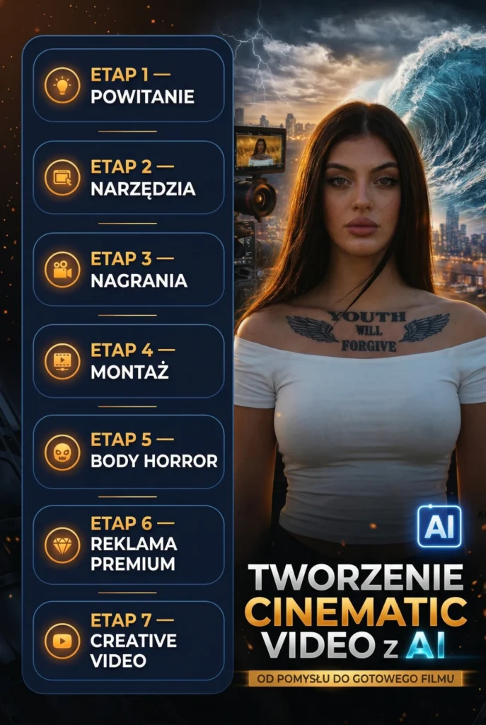 Celem kursu jest pokazanie, że profesjonalne i kreatywne wideo można tworzyć nawet bez dużego budżetu, jeśli wie się, jak połączyć klasyczne nagrania z możliwościami AI.
