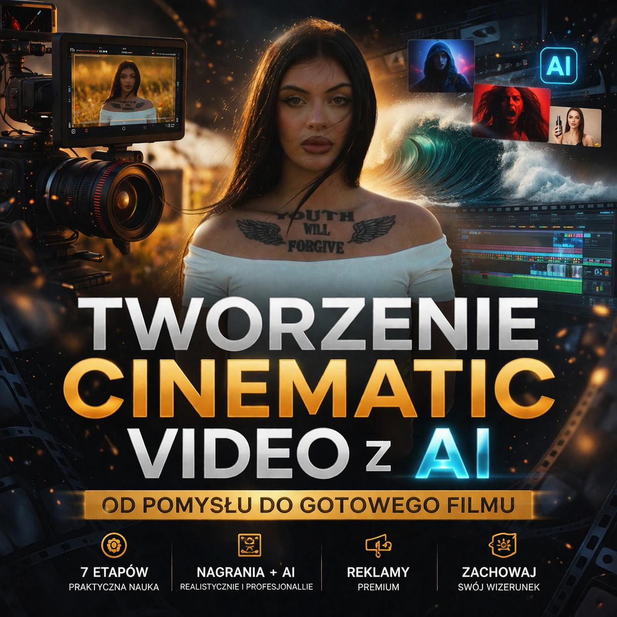 Po ukończeniu kursu będziesz w stanie samodzielnie stworzyć profesjonalne cinematic video — od pomysłu aż po gotowy film — wykorzystując AI i własny wizerunek.